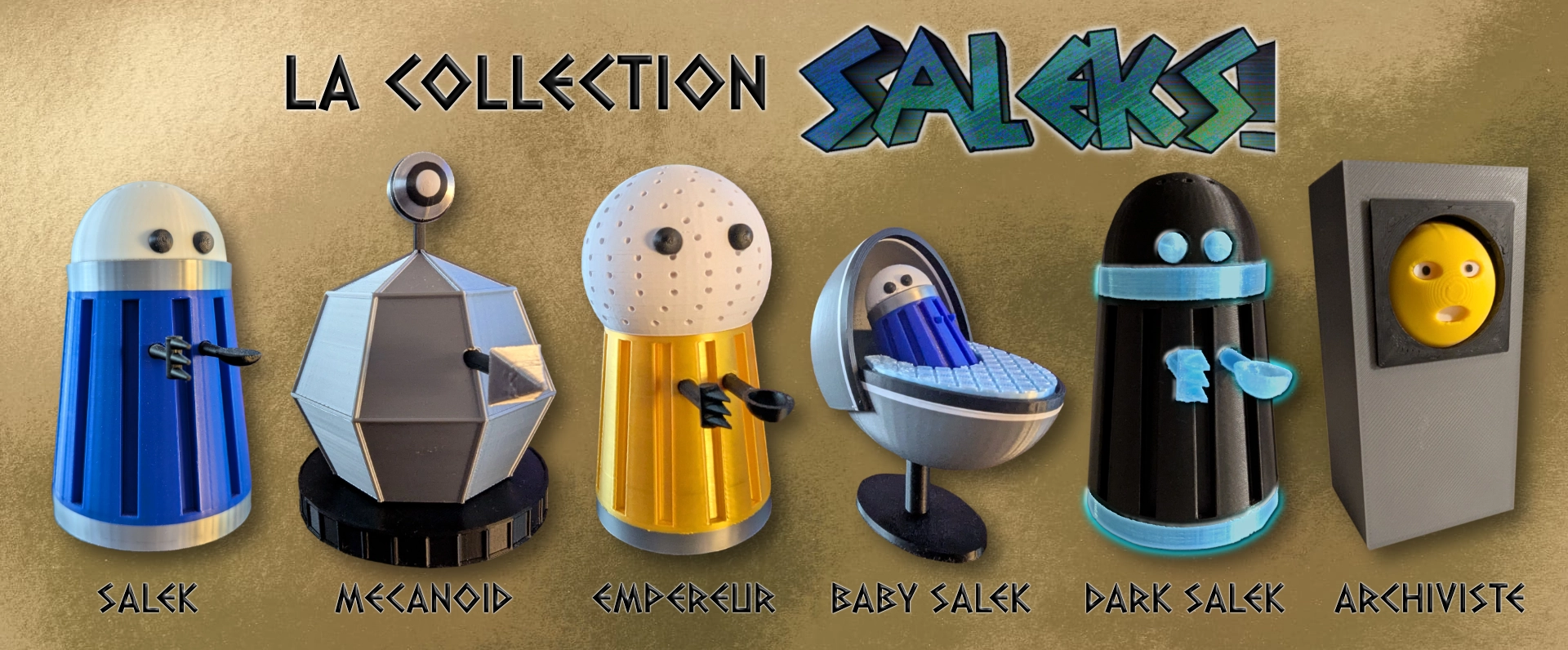 Six modèles seront disponibles durant ce financement participatif : Salek classique – Dark Salek (Phosphorescent) – Baby Salek – Mecanoid – Empereur Salek – Archiviste d'Archivos